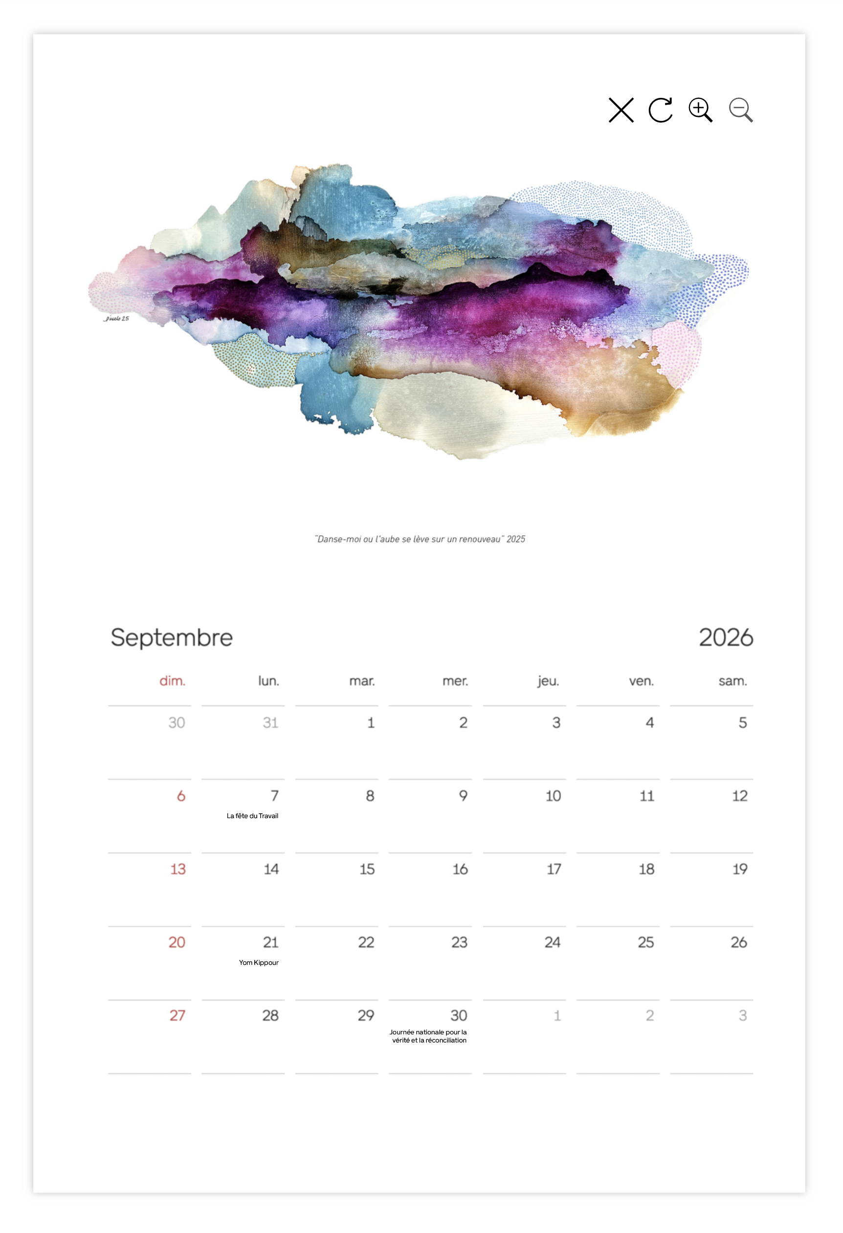 • Le calendrier est imprimé sur du papier de soie semi-brillant de 250 g/m² / 100 lb.