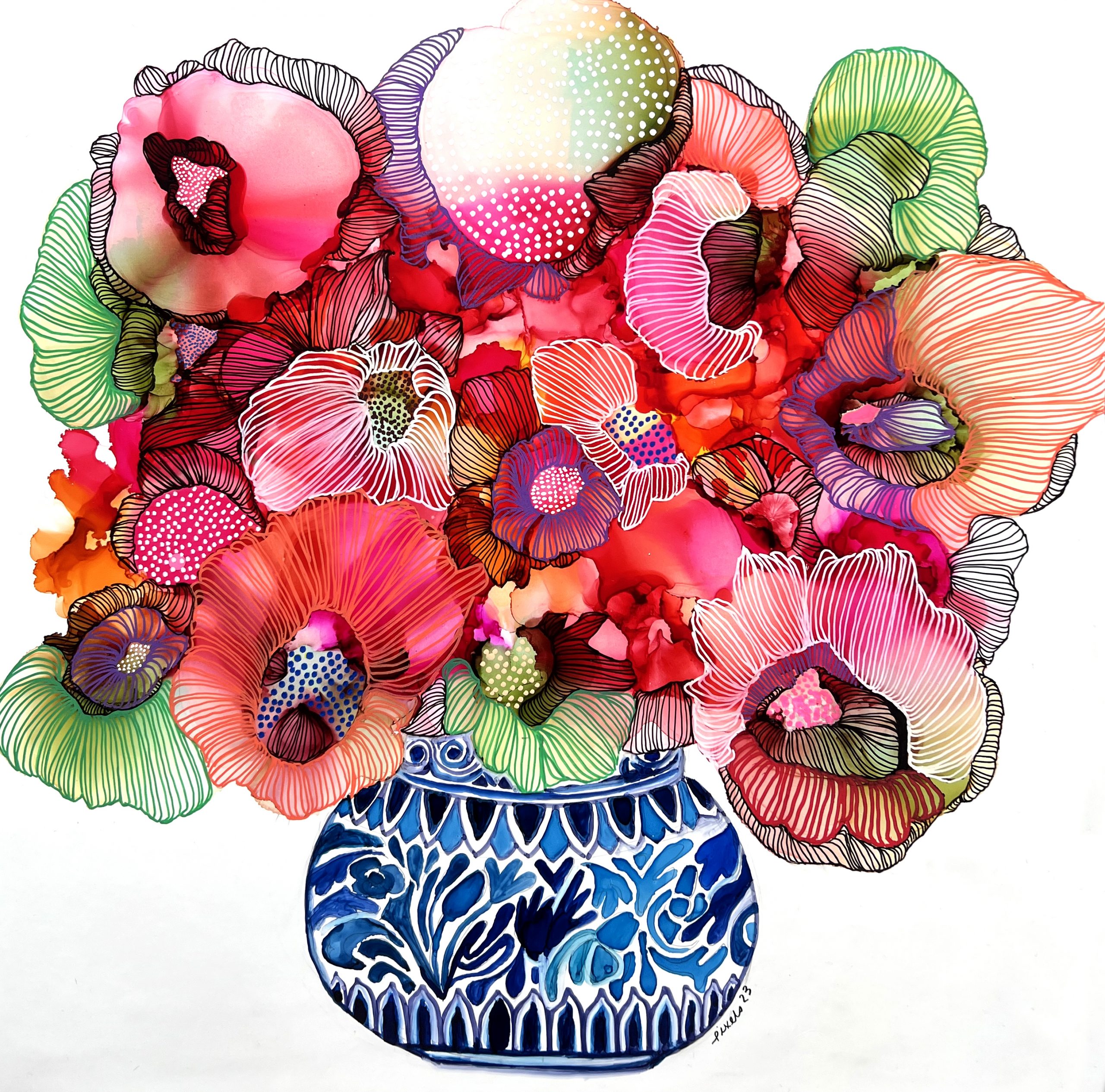Encre à l’alcool sur papier Nara marouflé sur bois